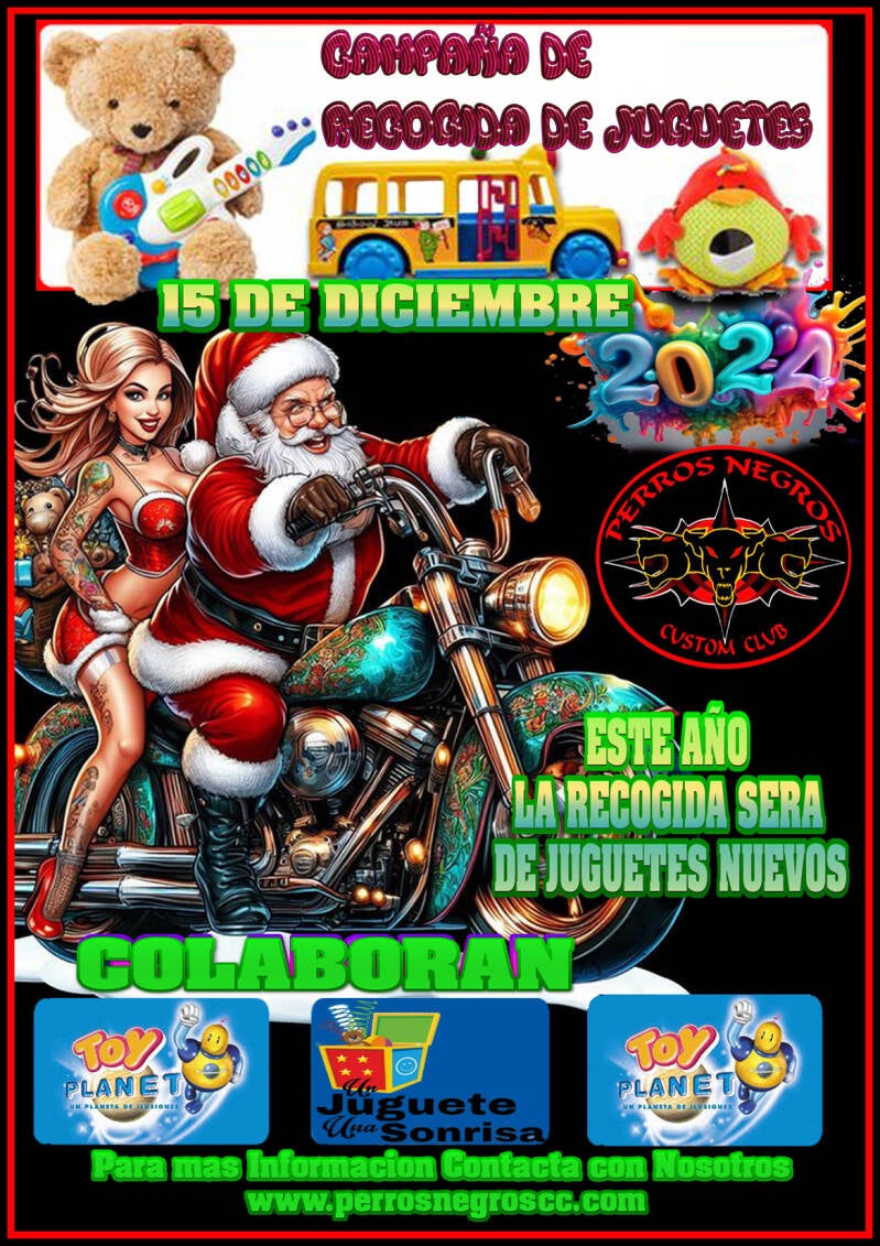 La campaña un juguete por una sonrisa, realizada desde hace más de quince años por PERROS NEGROS Custom Club,este año 2024 con el deseo de multiplicar objetivos, ya que cada año es mas difícil conseguir organizaciones benéficas destinadas a niños desfavorecidos y para lograr un mayor número de donaciones, hemos puesto en marcha hasta el 15 de diciembre de 2024 una campaña de recogida de “juguetes nuevos”, para que ningún niño se quede sin su regalo de Reyes Magos.